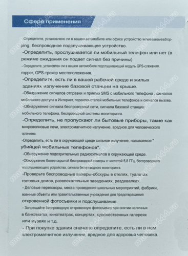 1) Поиск источников э/м излучения - сигналов от WIFI, GMS скрытых шпионских мини видео камер, прослушки; радио микрофонов, жучков маяков, УКВ радиостанций, передачи данных на сервер от GPS трекеров.