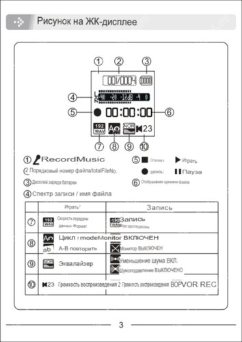 Включить диктофон. Нажать на центральную клавишу со значком треугольника и удерживать порядка 2 сек, пока не активируется (включится) дисплей – Welcome, затем отпустить. Выключить. Нажать на центральную клавишу со значком треугольника и удерживать порядка 2 сек, пока не выключится дисплей – ByeBye, затем отпустить. Включить аудиозапись. Перевести клавишу, что находится справа в положение вниз. Поставить аудио запись на паузу – нажать на центральную клавишу со значком треугольника. Продолжить аудиозапись – еще раз нажать на центральную клавишу со значком треугольника. Выключить аудиозапись. Перевести клавишу записи в положение вниз.