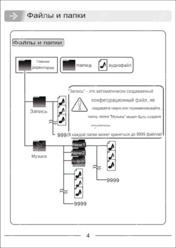 Прослушать записанные аудио файлы: 1) Динамики/наушники. По умолчанию заводскими настройками включены динамики, включать наушники через меню настроек. 2) При помощи ПК. Выключит питание. При помощи кабеля подключить к ПК. Прибор будет определен как карта памяти. Две папки – Записи и Музыка. Внимание, важно!! Не удалять.