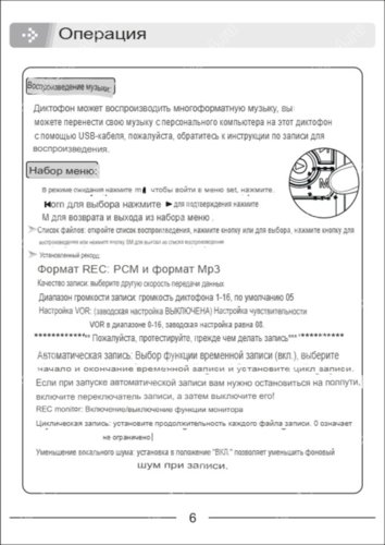 • запись: тип PCM/MP3; битрейт; наушники/динамики ВКЛ – ВЫКЛ; регулировка чувствительности микрофона; голосовая активация ВКЛ – ВЫКЛ; таймер ВКЛ – ВЫКЛ; сегментирование, установить длину файла; шумоподавитель ВКЛ – ВЫКЛ;