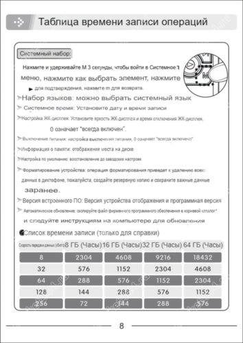 Выбор, поиск опции в меню настроек выполнять при помощи клавиш вперед – назад, подтверждение выбора, центральная клавиша со значком треугольника (ОК). Примеры: Страница 1/9 № 1) Выбрать строку English – ОК – выбрать строку Русский – ОК – выйти из меню М. №2) 1/7 Выбрать строку Запись – ОК – выбрать битрейт – OK – выбрать 1024 – ОК – М (нажимать один, либо два раза до выхода из меню настроек.)