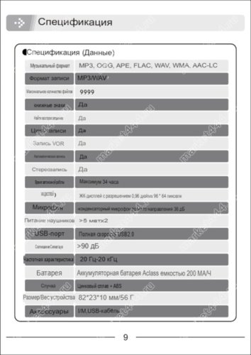 | 5. Формат воспроизведения файлов (плеер) | MP3/WAV, плеер MP3/OGG/APE/FLAC/WAV/WMA/AAC-LC, воспроизведение аудио при помощи динамика, наушников. |